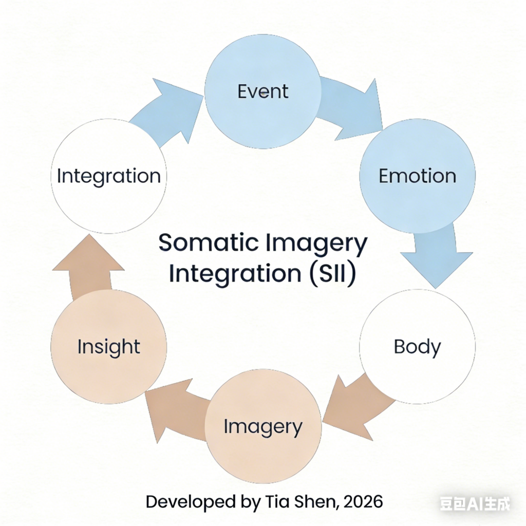 Somatic Imagery Integration (SII) is an integrative method for resolving emotional blocks and trauma-related patterns through a structured process that moves from cognitive awareness to embodied processing and symbolic transformation.